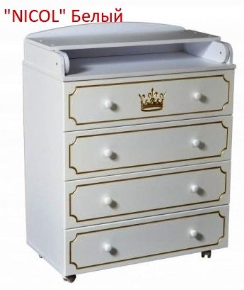 Пеленальный комод отличается привлекательным дизайном с использованием тематических детских принтов. В конструкции изделия предусмотрены 4 маленьких передвижных колеса, несколько вместительных ящичков на шариковых направляющих и откидывающаяся пеленальная столешница.