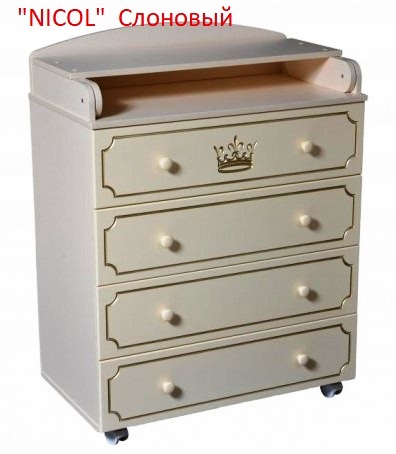 Пеленальный комод отличается привлекательным дизайном с использованием тематических детских принтов. В конструкции изделия предусмотрены 4 маленьких передвижных колеса, несколько вместительных ящичков на шариковых направляющих и откидывающаяся пеленальная столешница.
