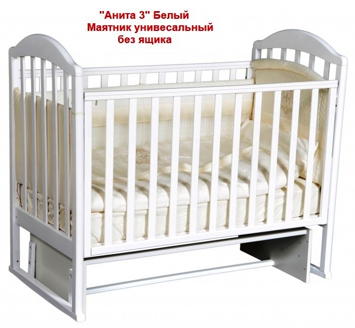 Кроватка Анита 3 укомплектована универсальным маятником, что позволит Вам собрать кроватку с функцией продольного либо поперечного качания в зависимости от того, как это требуется.